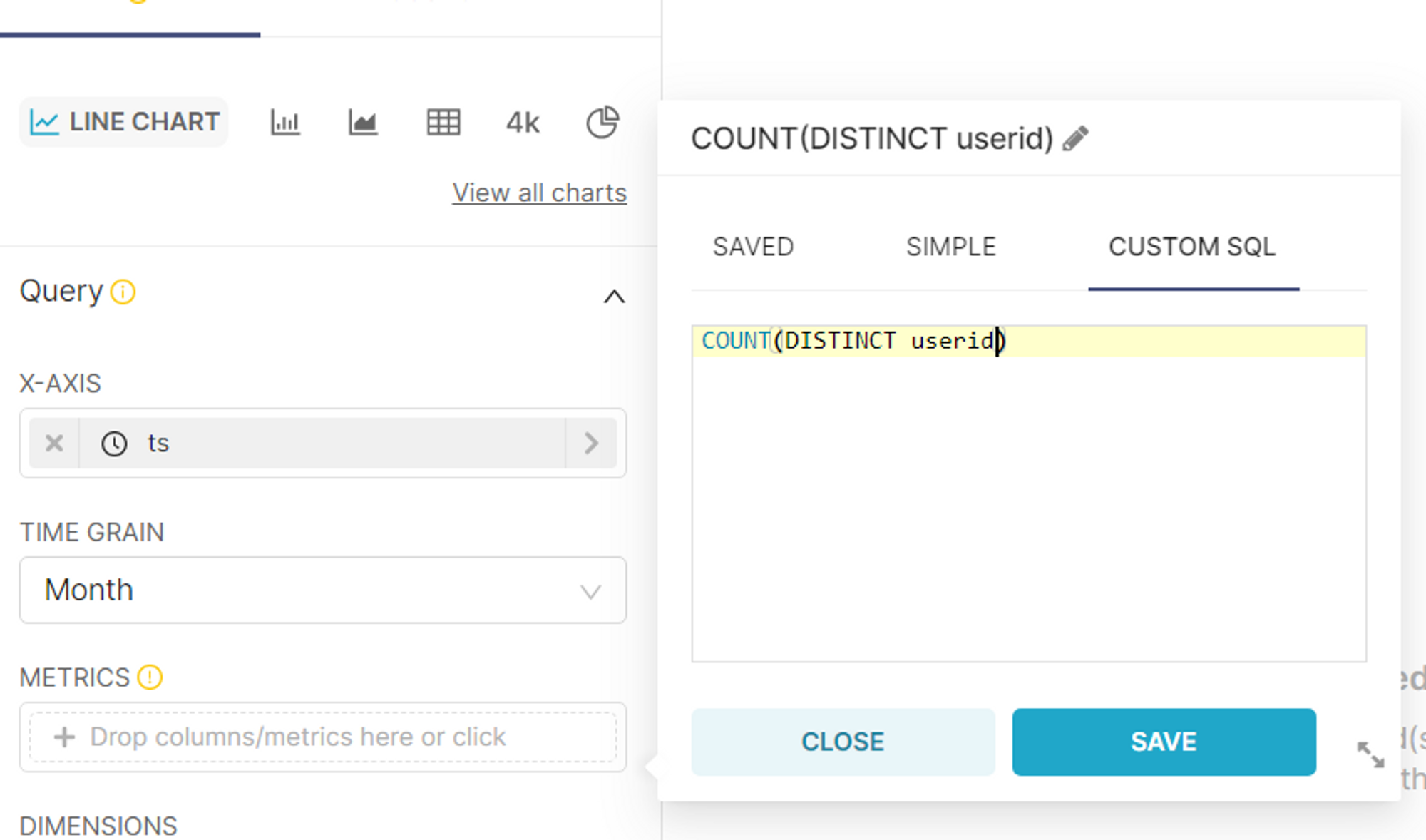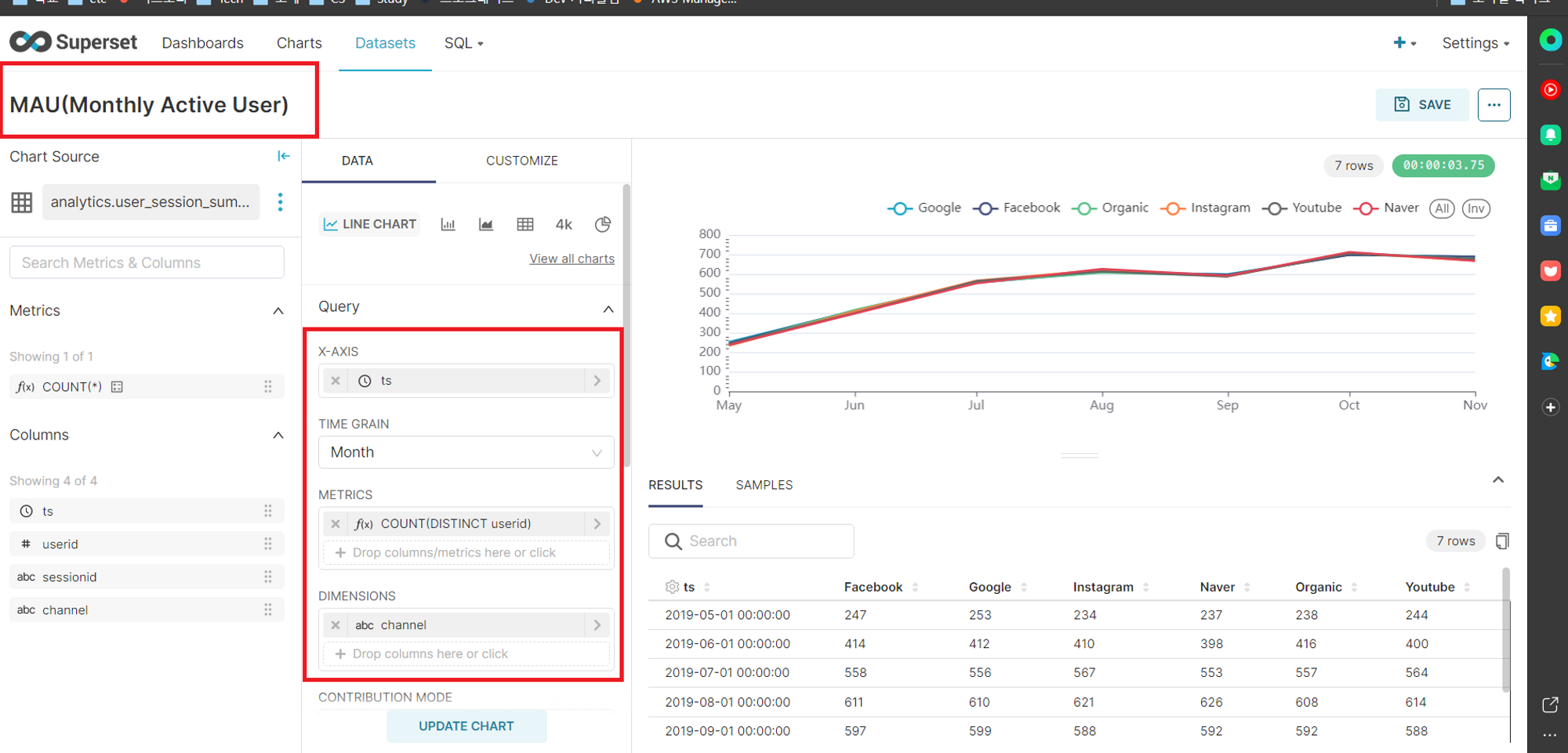 이때 y축은 따로 쿼리문을 지정해줘서 COUNT(DISTINCT userid)) 값이 되도록 한다.