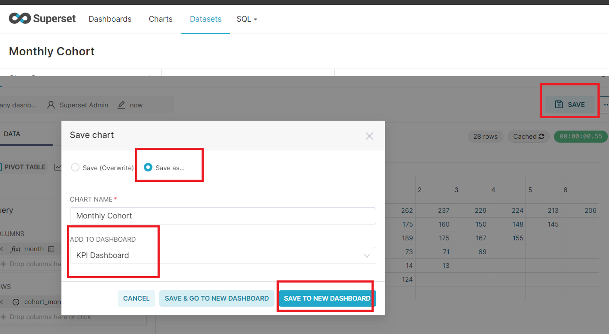 save as 로 저장하며 ADD TO DASHBOARD로 같이 가져간다.
