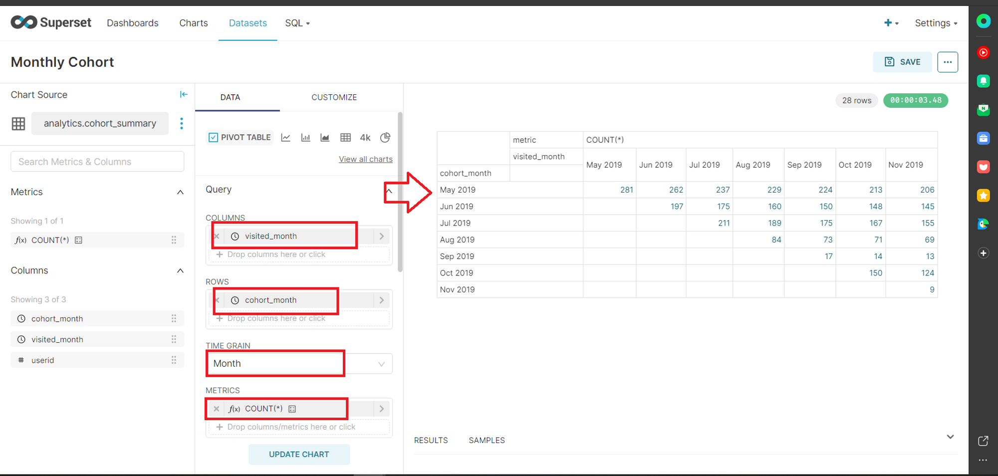 위 과정과 똑같이 이번엔 cohort_summary테이블 데이터 정보를 불러온다.