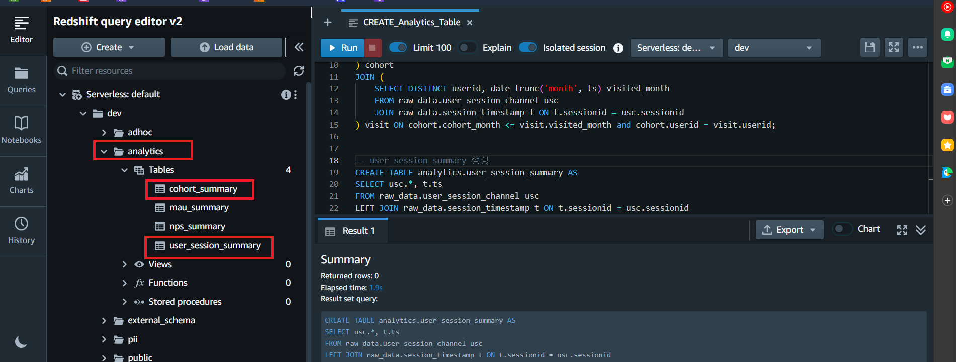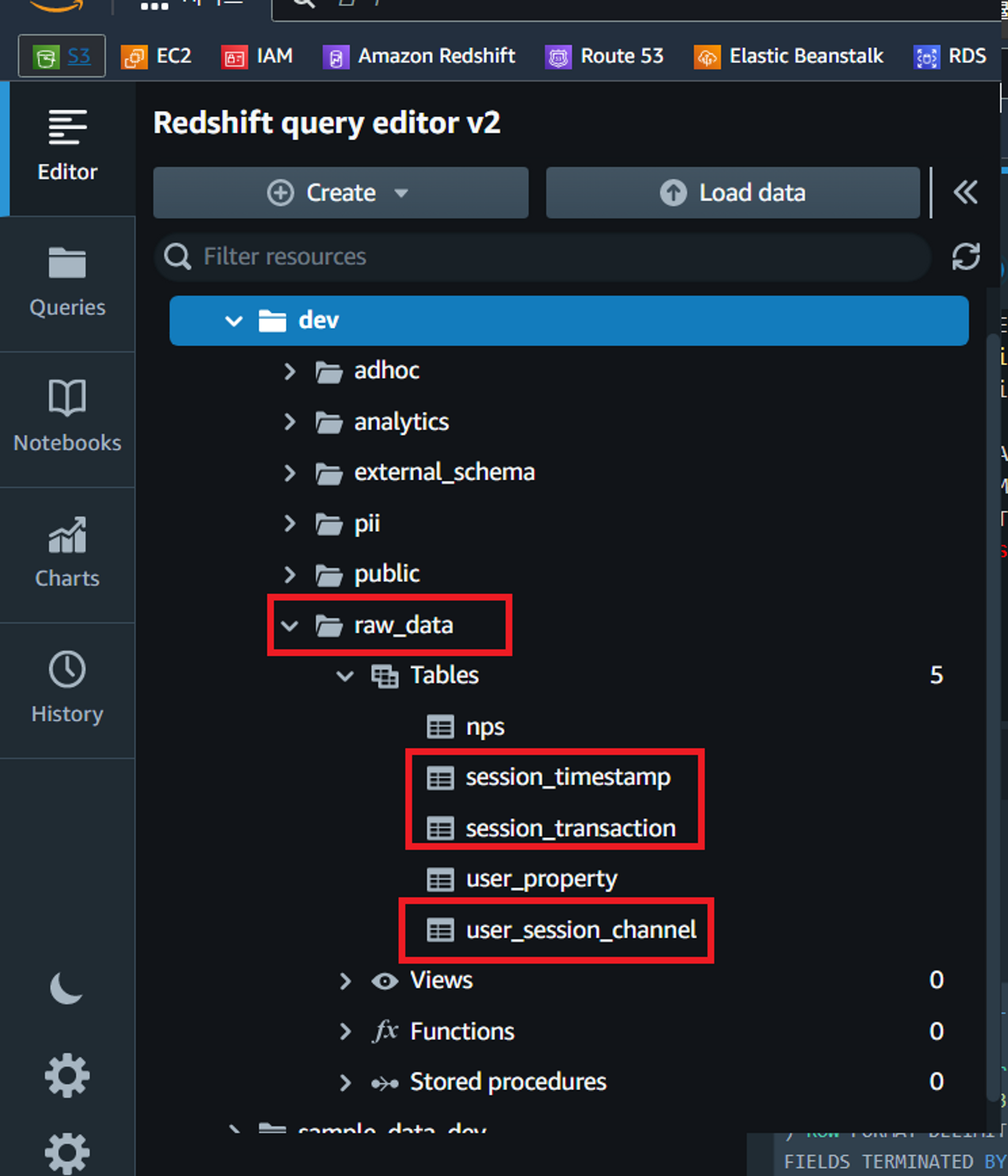 raw_data 스키마아래의 3개의 테이블 같은 경우는, 이전 실습에서 테이블을 생성하여 S3로부터 COPY명령어로 Bulk Update해와서 이미 셋팅된 상황이다.