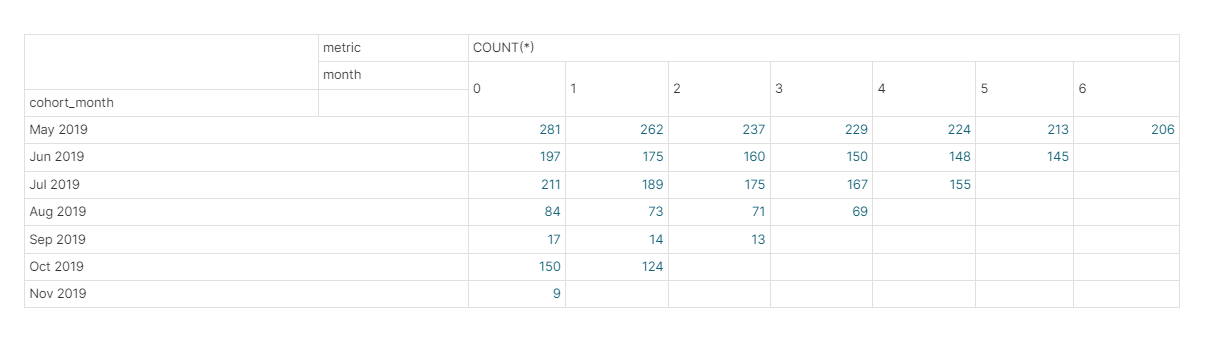 2019년 5월에 가입한 사용자가 281명인데, 그후 1달이 지났을 때는 그 중 262명의 사용자가 남아있다는 의미이다.