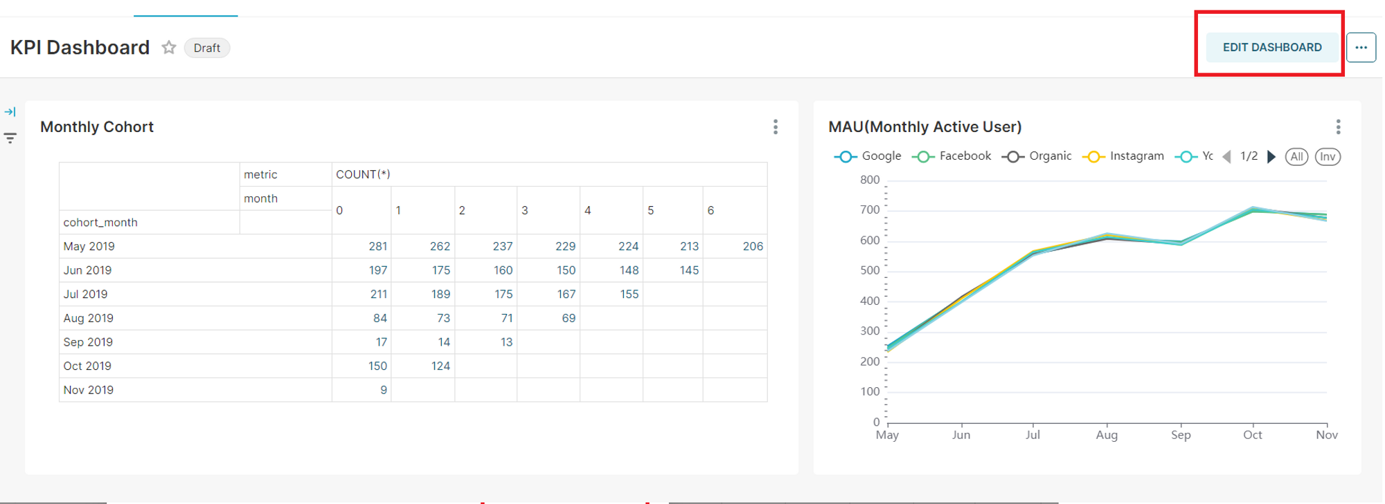Dashboard 탭으로 가서 KPI Dashboard를 클릭하면 MAU 차트와 Cohort차트가 있는 대시보드가 보일 것이다.