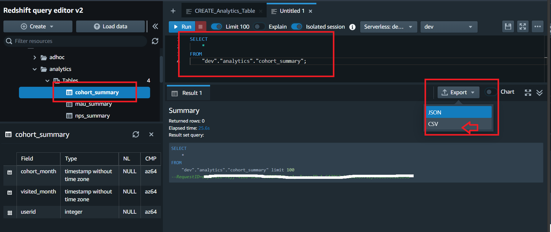 Redshift query editor에서 cohort_summary 테이블을 전체를 조회하고 그 결과를 CSV로 저장한다.