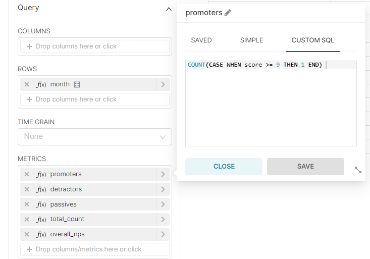 - promoters : COUNT(CASE WHEN score >= 9 THEN 1 END)