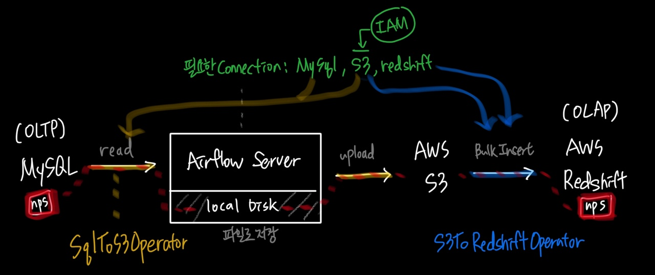 수업에서는 Mysql의 nps 테이블의 내용을 Airflow를 이용하여 S3에 적재 후, Redshift로 최종 데이터를 적재하는 실습을 진행하였다.