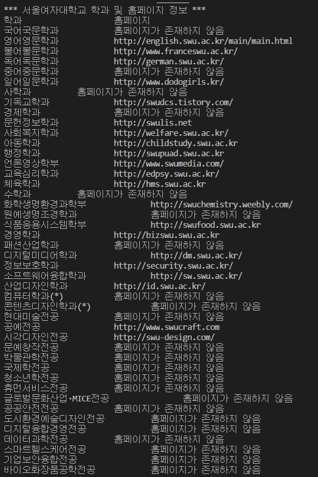 WebCrawler1_ 학교 홈페이지 웹크롤러 == 기능 == 학과 전공이 모여있는 학교 홈페이지에서, 학과&전공의 이름과, 학과 홈페이지 링크를 출력해준다. 학과 홈페이지가 없는 경우에는 '홈페이지가 존
