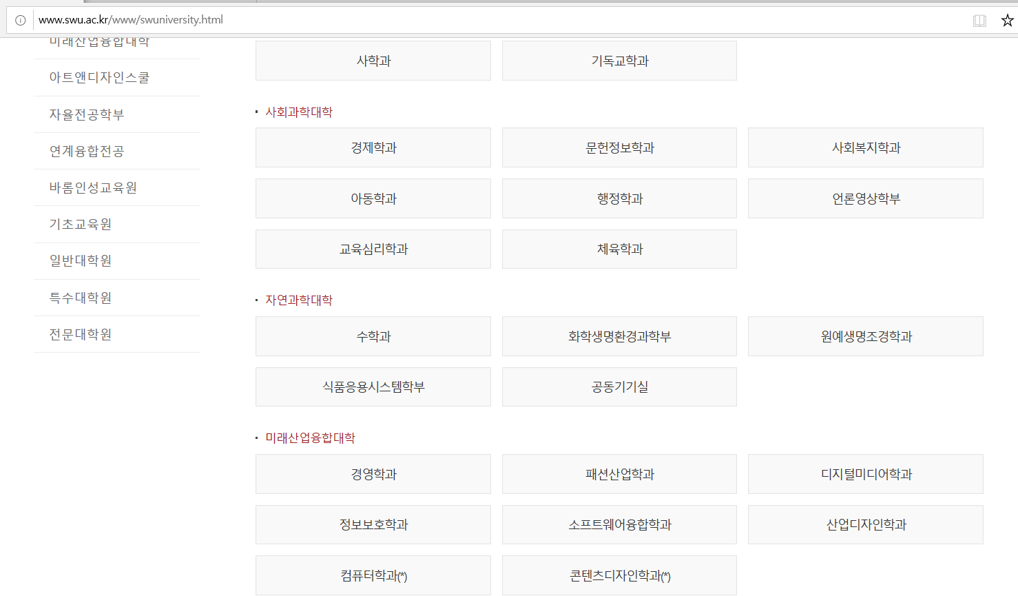 학과 홈페이지의 링크를 얻기 위해선, 학교 홈페이지(www.swu.ac.kr/www/swuniversity.html) 에 있는 각 학과 버튼을 통해, 페이지 이동이 필요하다.