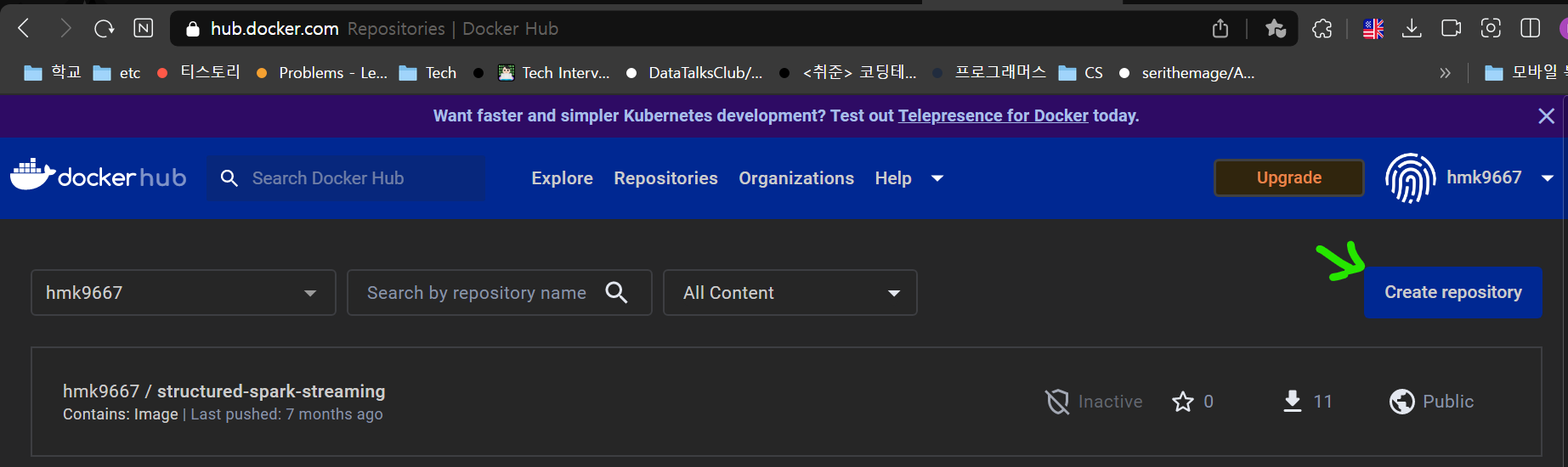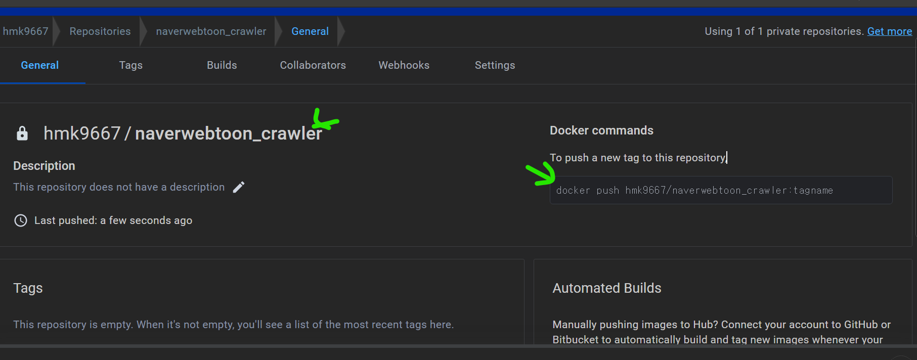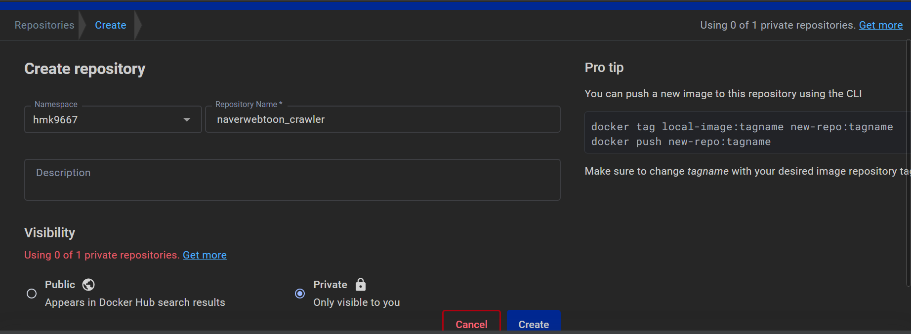 이제 만든 dockerhub의 private repository에 이미지를 push할 차례이다.