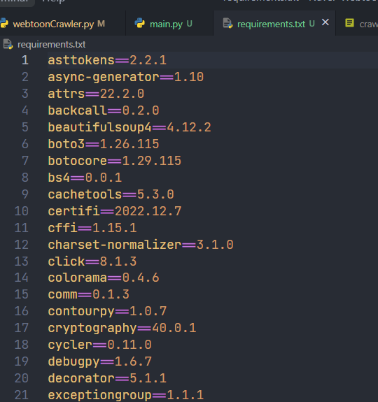 명령어를 실행하면 다음과 같이 pip으로 설치된 모든 라이브러리 목록이 저장된 것을 확인할 수 있다.