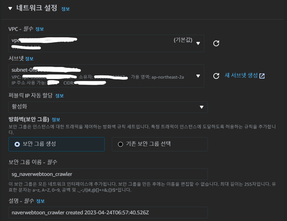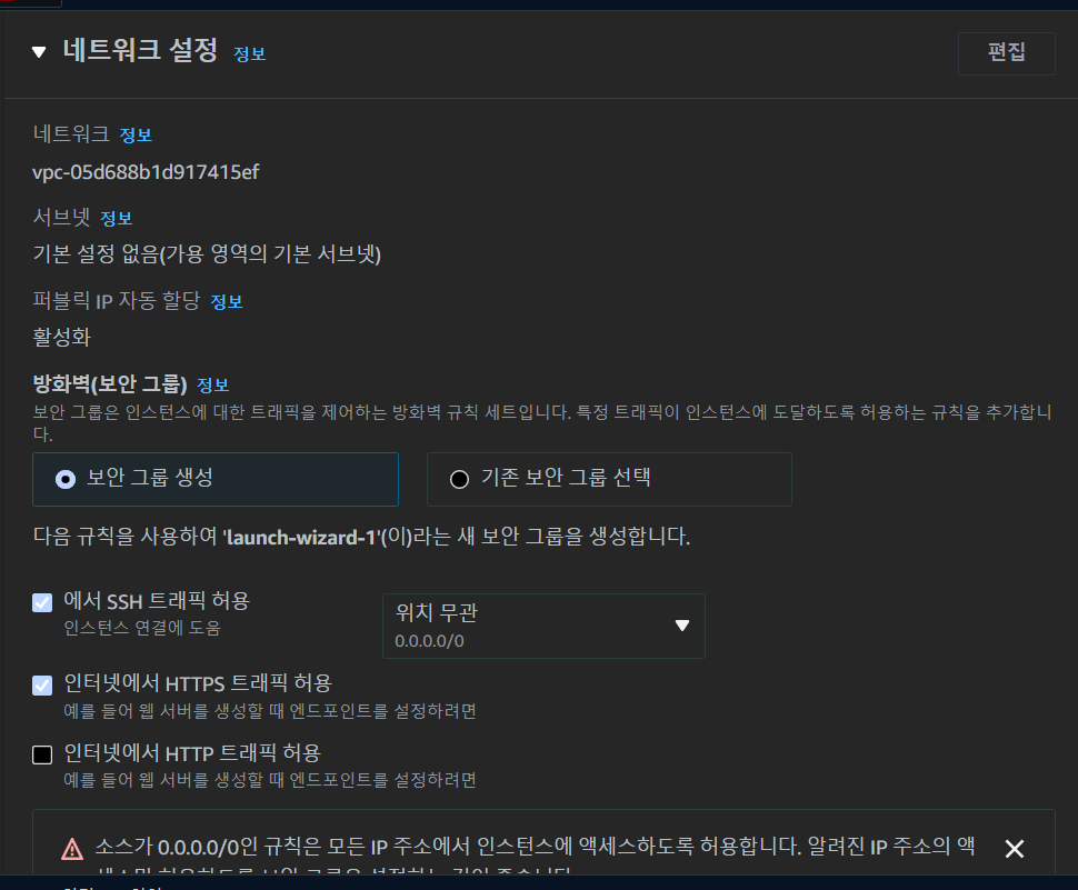 퍼블릭 ip 자동할당은 활성화, 그리고 방화벽을 즉 보안 그룹을 생성하였다.