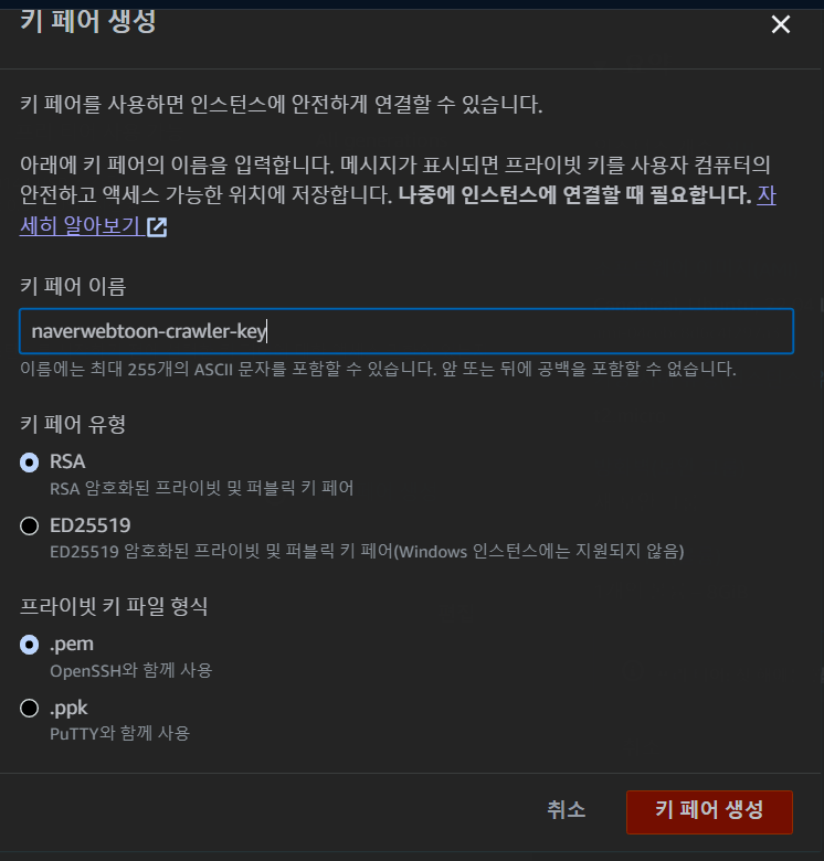 '새 키 페어 생성'을 눌러 키를 생성하자