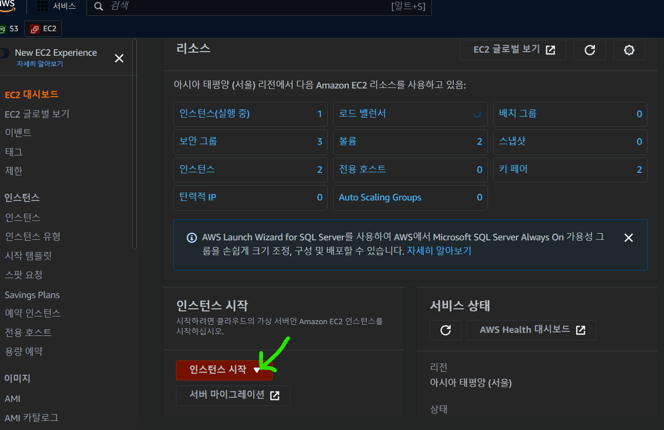 1. aws console 로그인 하고 검색창에 ec 검색후 '인스턴스 시작'하기를 누른다.