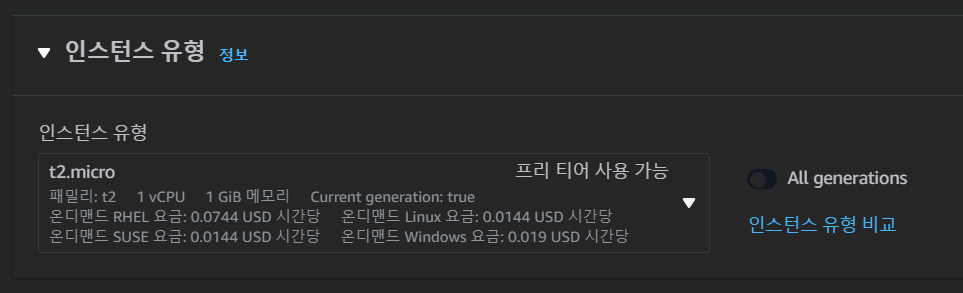 프리티어로 사용하기 위해 t2.micro로 설정함