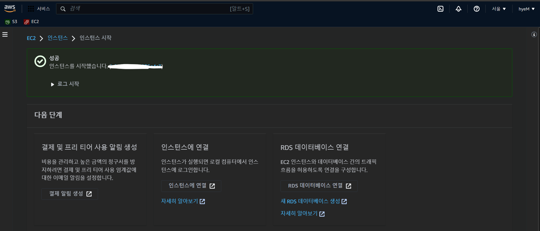 몇 초 지나면 인스턴스가 생성과 동시에 시작됐다는 문구를 확인할 수 있다.