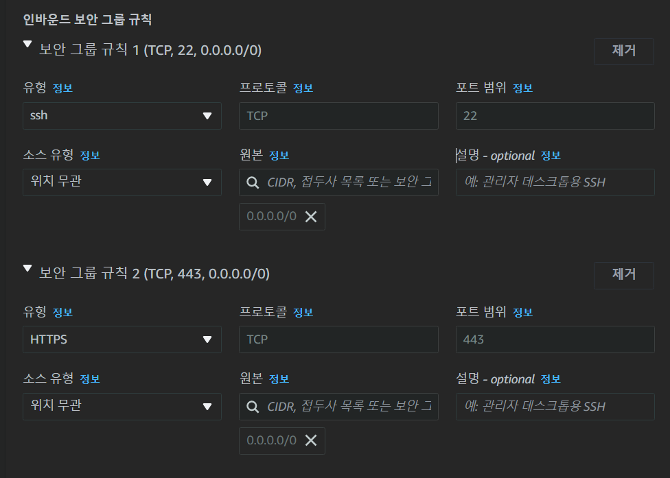 그리고 인바운드 규칙은 ssh와 https 기본 설정만 두었다.