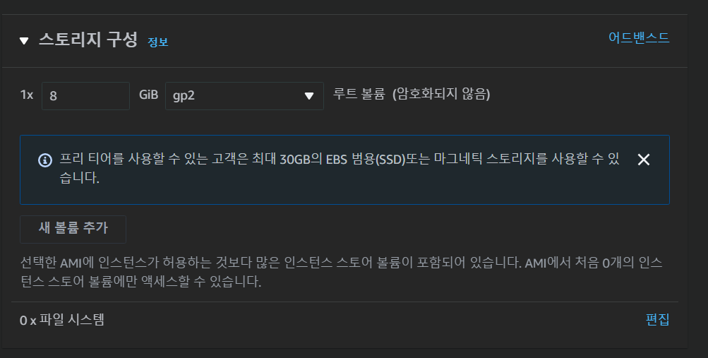 스토리지 설정 역시 프리티어에 맞게 기본 값을 그대로 두었다.