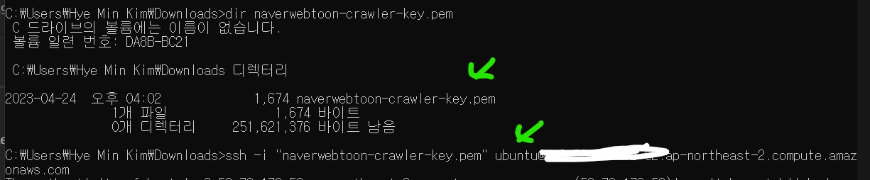 인스턴스에 접속하는 방법은 위에 나와있듯이 4가지인데 글쓴이는 위에서 발급받은 key를 가지고 ssh 연결을 하고자 한다.