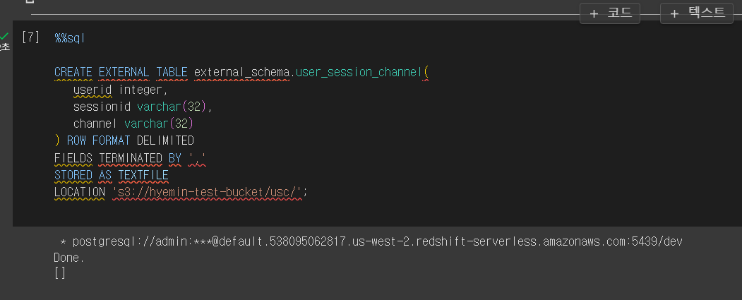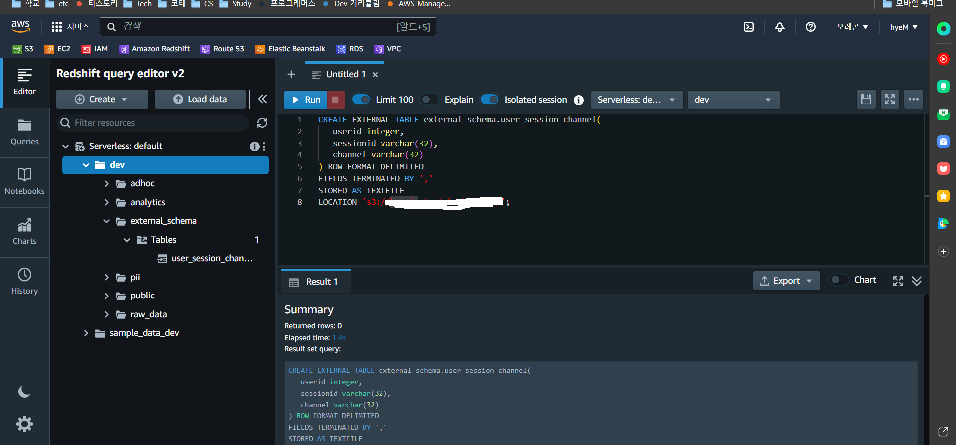 오류를 다시 해결해보고자, 기존에 AWS console창에서 만들었떤 EXTERNAL TABLE 스키마 아래에 user_session_channel 테이블을 삭제하고, 다시 colab에서 접속해서 똑같이 쿼리문을 실행해 보았다.